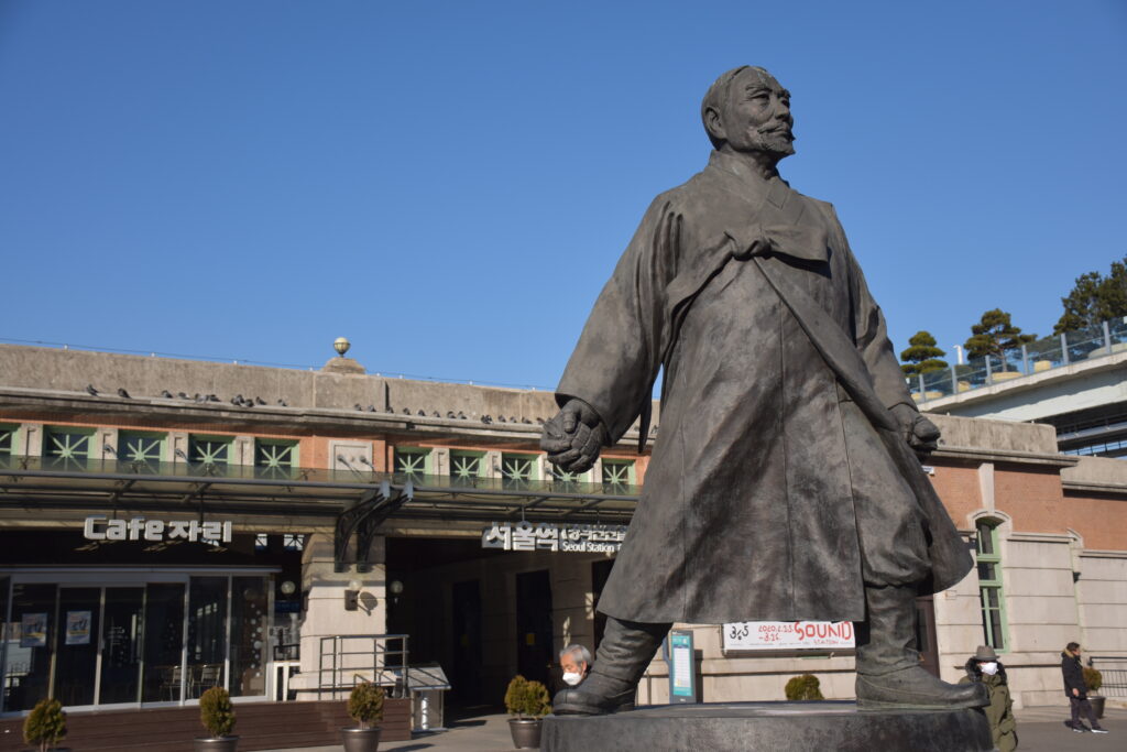 ソウル駅では、京義線の乗り場だけ少し離れていた。乗り場の前には、右手に手榴弾を持った姜宇奎像が立っていた。電車の本数は少なかったので、いくらか待った後乗り込んだ。