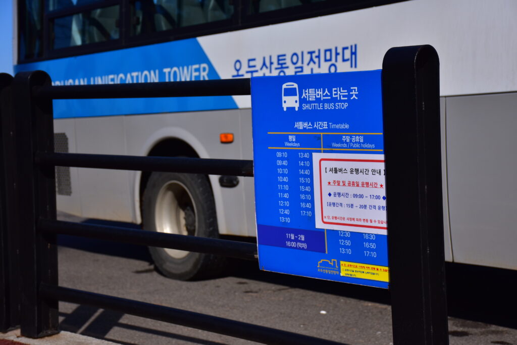 ソウル駅から京義線の金村駅にて下車後、900 番のバスに終点まで 40 分程乗ると、 専用シャトルバスの乗り場がある。そこから数分バスに乗ると、鳥頭山統一展望台 まで行くことができる。およそ 2 時間の道程。