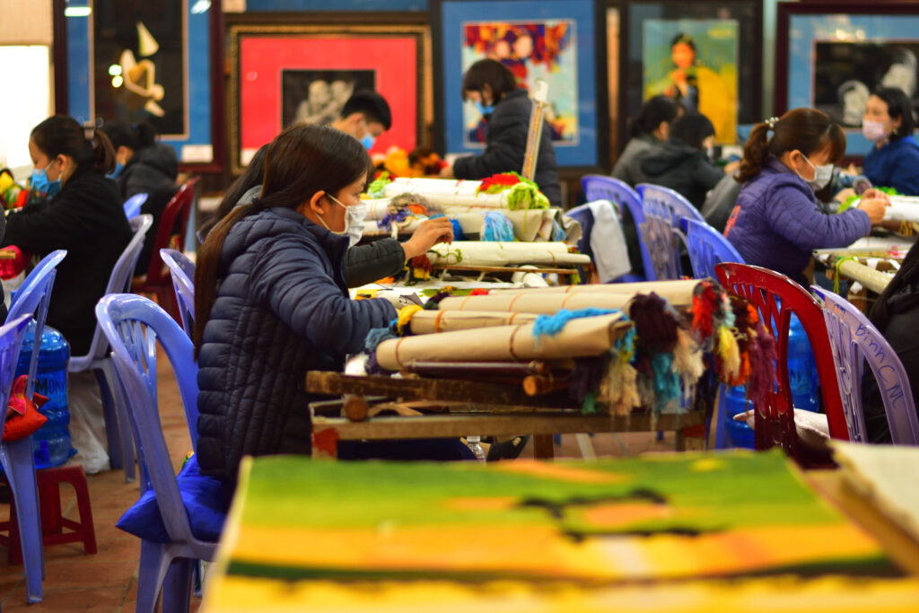 ▲ ベトナム戦争化学兵器被害者の方々。一針一針作業を進める。