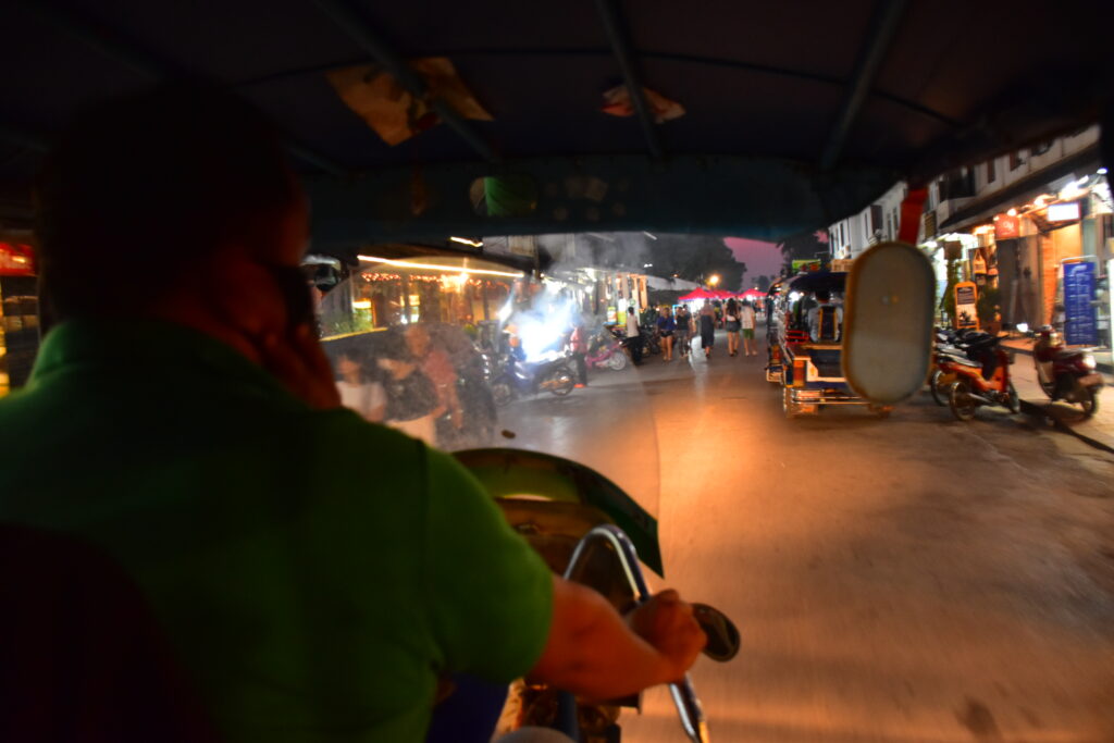 バスターミナルまでのトゥクトゥクは午後 6 時半にホテルまで来た。7 時から 7 時半の間に来るよと聞いていたので、少々驚いたが、急かされながらも荷物をまとめて乗り込んだ。
