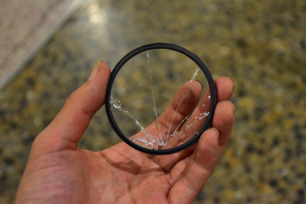 ▲ 割れた保護フィルター。幸い前玉は無傷だった。