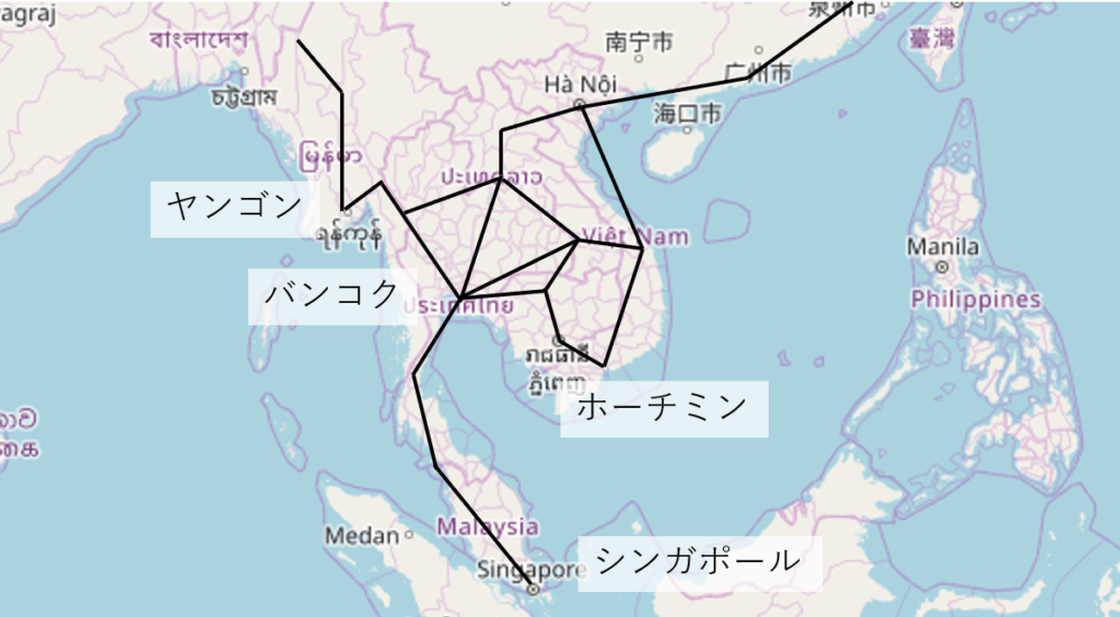 ▲ 東南アジアの主要な陸路ルート(推定)
