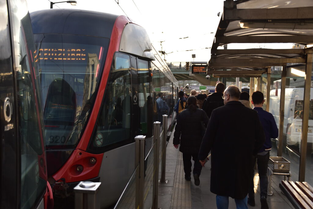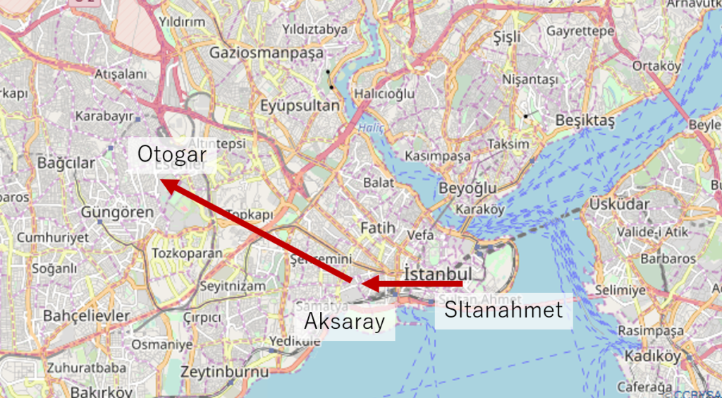 イスタンブールのバスセンターまでは、中心地からトラムとメトロを乗り継ぐ必要がある。まずはトラムで「sltanahmet」から「Aksaray」まで移動する。そこからは歩いてメトロの「Aksaray」に行き、「Otogar」にて下車する。