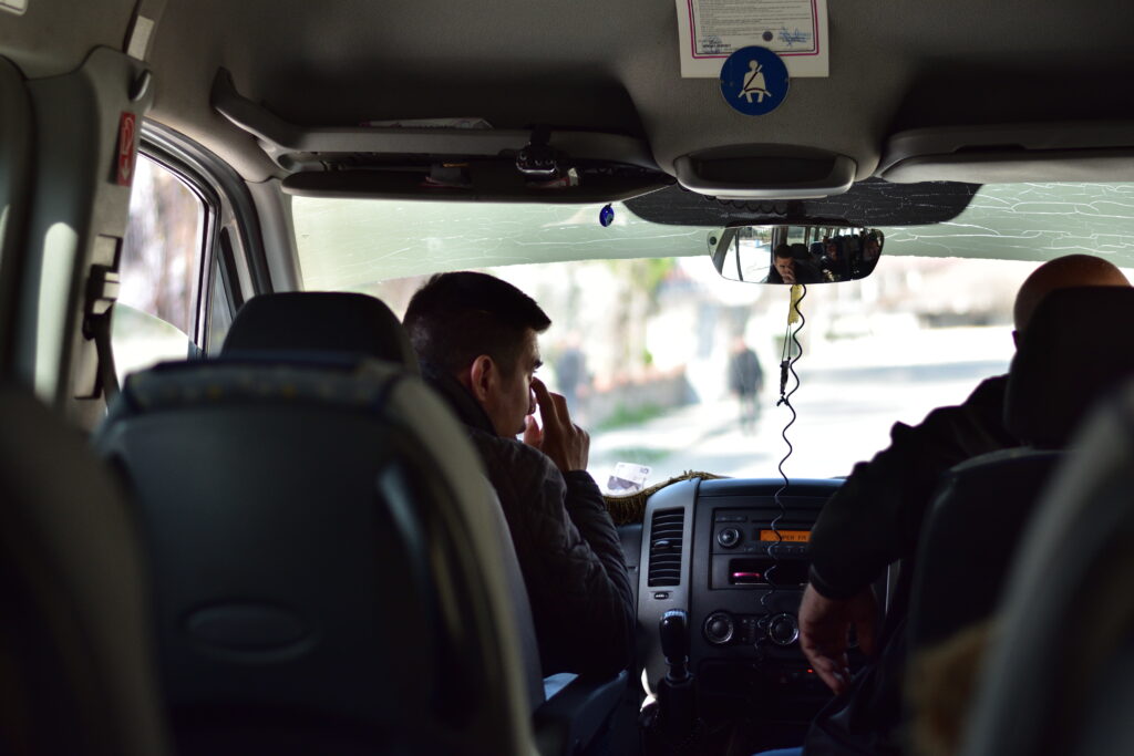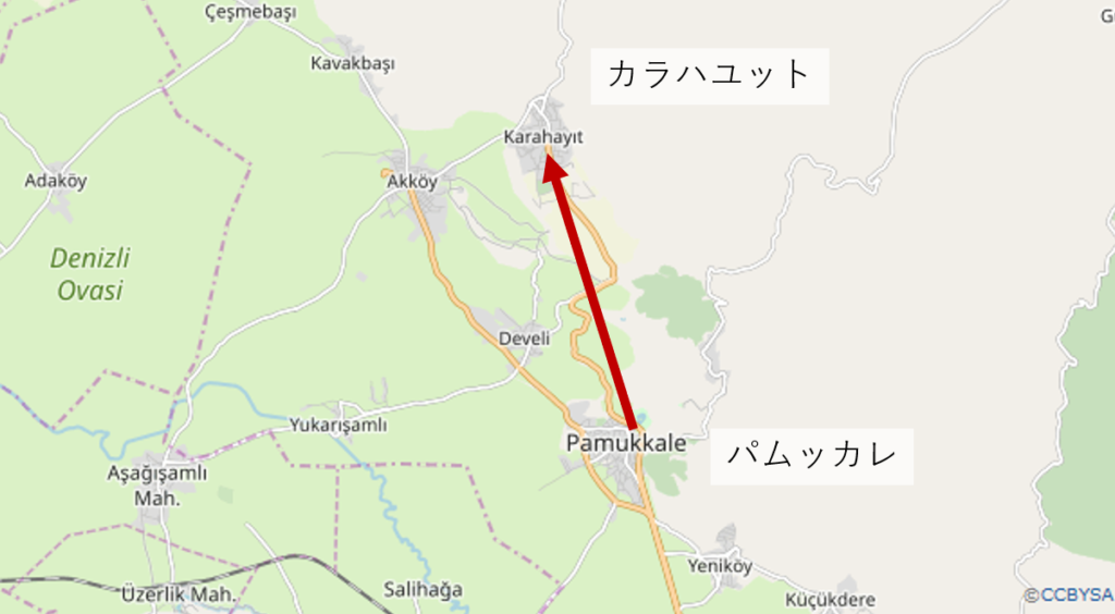 カラハユットはパムッカレからおよそ 10 km ほど、バスで 15 分有れば行くことが出来る。「Meydan Fastfood」の前で暫く待っているとバスは来た。料金は片道 3.5 リラ(約 60 円)。バス停は無く、通り沿いで手を振って乗り込む。