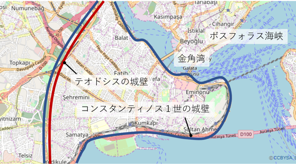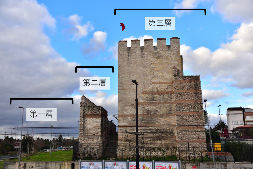 コンスタンティノープルの城壁は三重構造になっている。まず、第一層の某柵より外側には約 20 mの堀があった。第二層には外壁があって、最後の第三層の内壁は、高さ 12 m、幅 5 mの強固な壁であったという。外壁、内壁には交互に物見塔が立っていた。