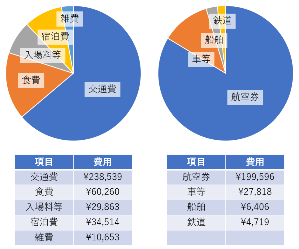 合計を日割りすると、一日あたり約 4,700 円。1年間で約 170 万円使う計算になるが、陸路移動を増やせばもっと安くなりそうだ。